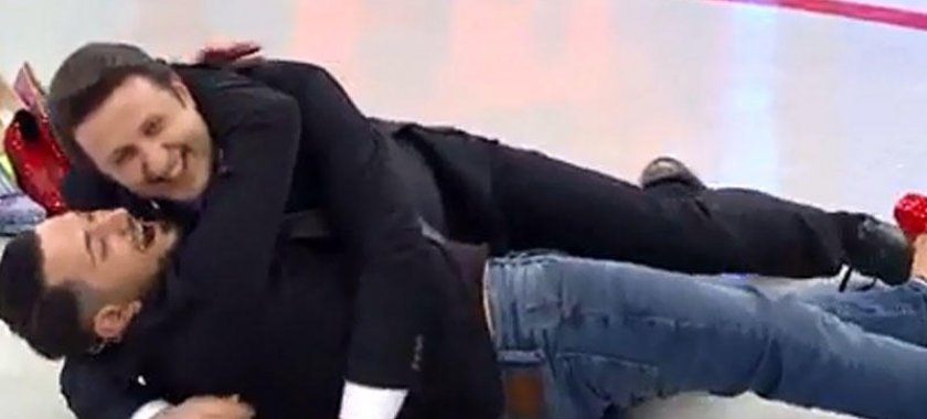 Erdoğanın aparıcını qucaqlayıb, yerə yıxması isə insanları qəhqəhəyə boğub.