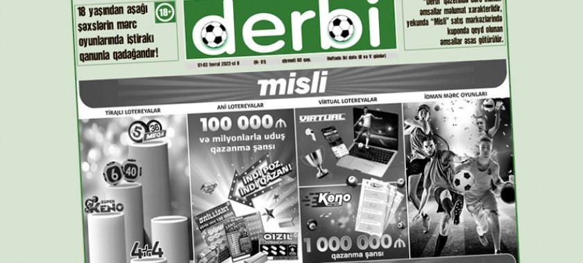 "Derbi" qəzetində "Azərlotereya” ASC-nin Azərbaycan Respublikası qanunvericiliyi çərçivəsində fəaliyyət göstərən mərc oyunları markası "Misli”-nin idman yarışlarına olan əmsalları, şirkətin müxtəlif məhsulları – tirajlı lotereyalar, ani lotereyelar və virtual lotereyeları barədə məlumatlar dərc olunacaq.