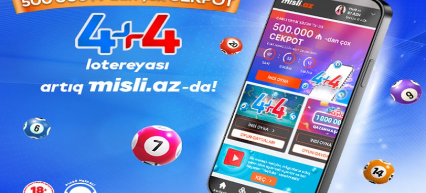 Həftədə 4 dəfə - bazar ertəsi, çərşənbə, cümə və şənbə günləri keçirilən "4+4” oyununda hazırda 500 000 manatdan böyük cekpot şanslı qalibini gözləyir. "Misli.az” saytında "4+4”lə yanaşı, 1 000 000 manat böyük uduşlu "Super KENO” lotereya biletlərini də onlayn almaq imkanı təqdim olunur.