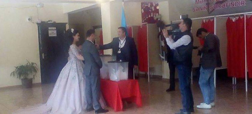 İcmal.Az azxeber.com-a istinadən xəbər verir ki, səsvermə günü toyu olan cütlük seçki məntəqəsinə gəlib.