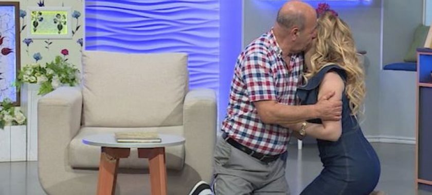 Studiyaya ayaq basan Roza Zərgərli də Əli Mirəliyevin yanına gələrək diz çöküb və onu qucaqlayıb.