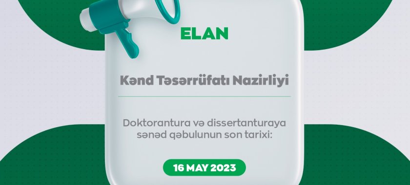 Kənd Təsərrüfatı Nazirliyi Azərbaycan Respublikası Nazirlər Kabinetinin 2023-cü il 10 mart tarixli Sərəncamı ilə təsdiq olunmuş "Azərbaycan Respublikasının ali təhsil müəssisələrinin, elmi təşkilatların 2023-cü il üçün doktorant və dissertant hazırlığı üzrə qəbul planı”na əsasən Azərbaycan Dövlət Aqrar Universiteti, "Aqrar Tədqiqatlar Mərkəzi” publik hüquqi şəxs və elmi tədqiqat institutlarına fəlsəfə doktoru və elmlər doktoru hazırlığı üzrə doktorantura və dissertanturaya qəbul elan edir.