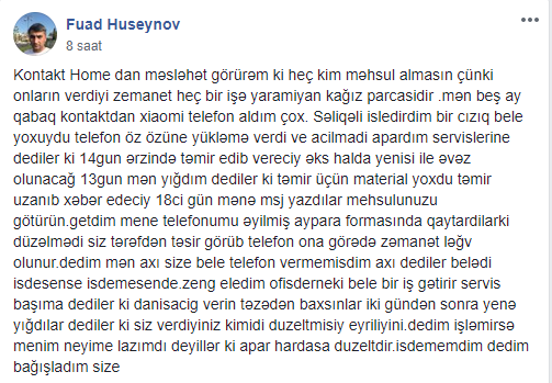 Budəfəki şikayət mağazada məhsullara verilən zəmanətlə bağlı olub. Fuad Hüseynov adlı sosial şəbəkə istifadəçisinin sözlərinə görə, "Kontakt Home" aldığı mobil telefonun bir müddət sonra işləmədiyini bildirib: