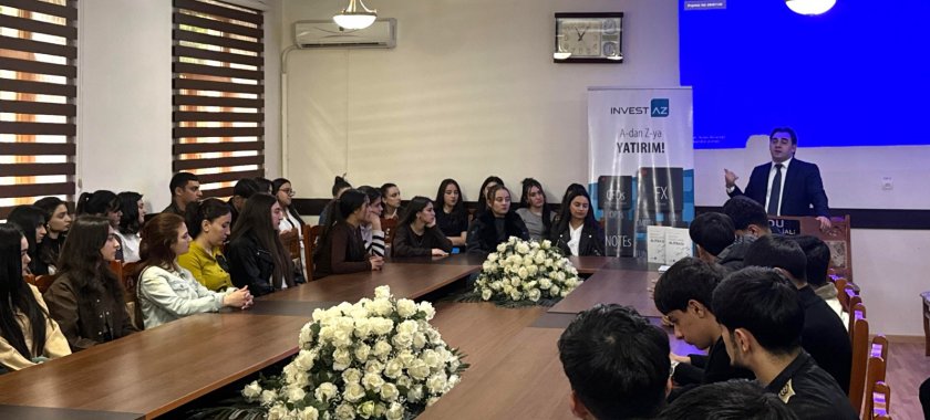 "Invest-AZ İnvestisiya Şirkəti” QSC-nin tədris üzrə baş mütəxəssisi, iqtisad üzrə fəlsəfə doktoru Rövşən Məmmədov "Birjada qiymətin dəyişməsindən necə qazanmaq olar ? ” mövzusunda, şirkətin maliyyə məsləhətçisi Rəşad Mustafayev isə "Bitcoin haqqında məlumat” başlıqlı təqdimatla çıxış edib. Seminar çərçivəsində tələbələrə maliyyə bazarının funksiyaları, investisiya imkanları, risklərin idarə olunması, qiymətli kağızların alqı-satqısı və iqtisadiyyatdakı rolu barədə ətraflı məlumat verilib.