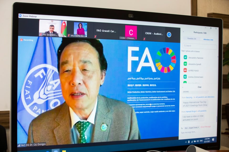 Açılış nitqində BMT-nin Ərzaq və Kənd Təsərrüfatı Təşkilatının baş direktoru QU Dongyu dünyada çayçılığın mövcud vəziyyəti, bu sahənin iqtisadi əhəmiyyəti və potensial imkanları barədə məlumat verib. FAO-nun Baş Direktoru Dayanıqlı İnkişaf Məqsədlərinin həyata keçirilməsində irəliləyişlərə nail olunması, müasir dayanıqlı kənd təsərrüfatının və onun inkişafının təşviq edilməsi üçün ölkələrarası əməkdaşlığın gücləndirilməsinin vacib olduğunu diqqətə çatdırıb.