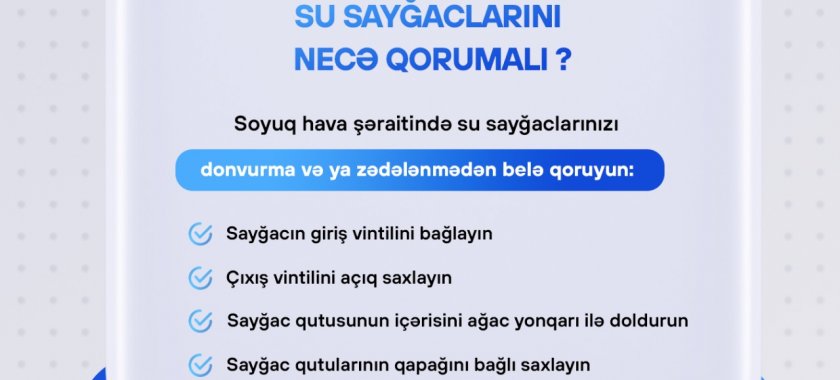 İstehlakçıların diqqətinə çatdırırıq ki, fərdi yaşayış evlərində, həyətyanı sahələrdə, kommersiya obyektlərində quraşdırılmış sayğacların şaxtalı günlərdə donvurma nəticəsində sıradan çıxmasının qarşısının alınması üçün zəruri və qabaqlayıcı tədbirlərin görülməsi vacibdir. Şaxtanın daha çox olduğu gecə saatlarında sayğac içərisində suyun qalmamasına görə sayğacın giriş vintili bağlanmalı, çıxış vintili açıq saxlanılmalı, sayğac qutusunun qapağı bağlı qalmalıdır. Donvurmadan mühafizə tədbirləri məqsədilə açıq havada qalan boruları, sayğacın özünü isti materiallarla örtmək, qutunun içərisini ağac yonqarı ilə doldurmaq vacibdir.