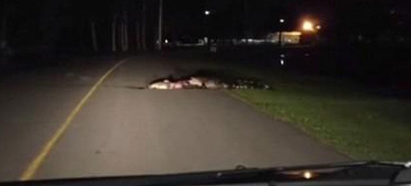 5 metr uzunluğunda nəhəng alliqator tutduğu şikarını yolun ortasında parçalayıb yeyirdi. O, maşının işıqlarını görəndə şikarını dişinə alıb yol kənarındakı gölə çəkilib.