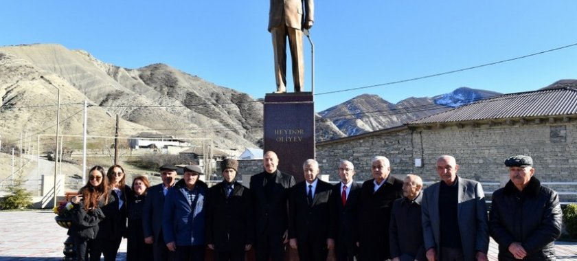 Prezidenti İlham Əliyev, birinci xanım Mehriban Əliyeva və qızları Leyla Əliyeva Qonaqkənd sakinləri ilə birlikdə ulu öndər Heydər Əliyevin qəsəbənin mərkəzində ucaldılan abidəsinin önünə gül dəstəsi qoyublar.
