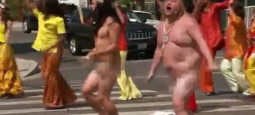 Bu dəfə o, yolda hərəkət edən avtomobillərin qarşısını kəsib. Piyada keçidində "Hair” myuziklı ilə "Let the Sunshine” mahnısını oxuyan aparıcı əynindəki paltarı soyunaraq çılpaq rəqs etməyə başlayıb.