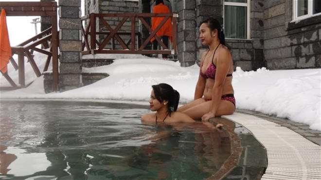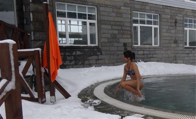Soyuq diyar olan Uzaq Şərqdən gəlmiş həmin qadınlar mənfi 10 dərəcə şaxta şəraitində açıq havadakı hovuza giriblər.